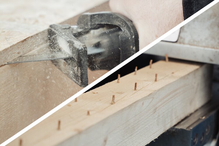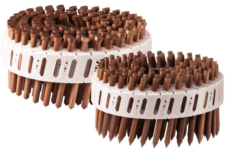 Ja. Da LIGNOLOC® Holznägel vollständig aus Holz bestehen und beim Einschießen eine stoffschlüssige Verbindung eingehen, können CLT- und andere Massivholzelemente ohne zusätzliche Vorsortierung zerspant, geschreddert oder weiterverarbeitet werden. Die Holznägel verhalten sich wie der umgebende Werkstoff und verursachen keine Beschädigungen an Werkzeugen oder Anlagen. Das erleichtert die Sortenreinheit, senkt die Entsorgungskosten und verbessert die Wiederverwertbarkeit erheblich.