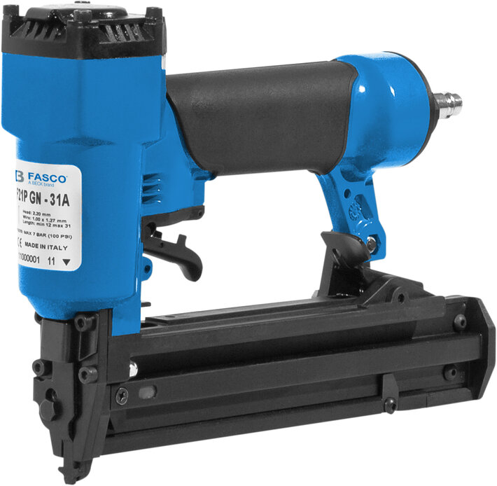 Rubber comfort grip ensures non-slip handling and reduces vibrations and fatigue. Patented quick clear system for jams. The side window on the magazine provides a view of brads to reduce dry-fire. No-mar tip avoids marking of softwood.